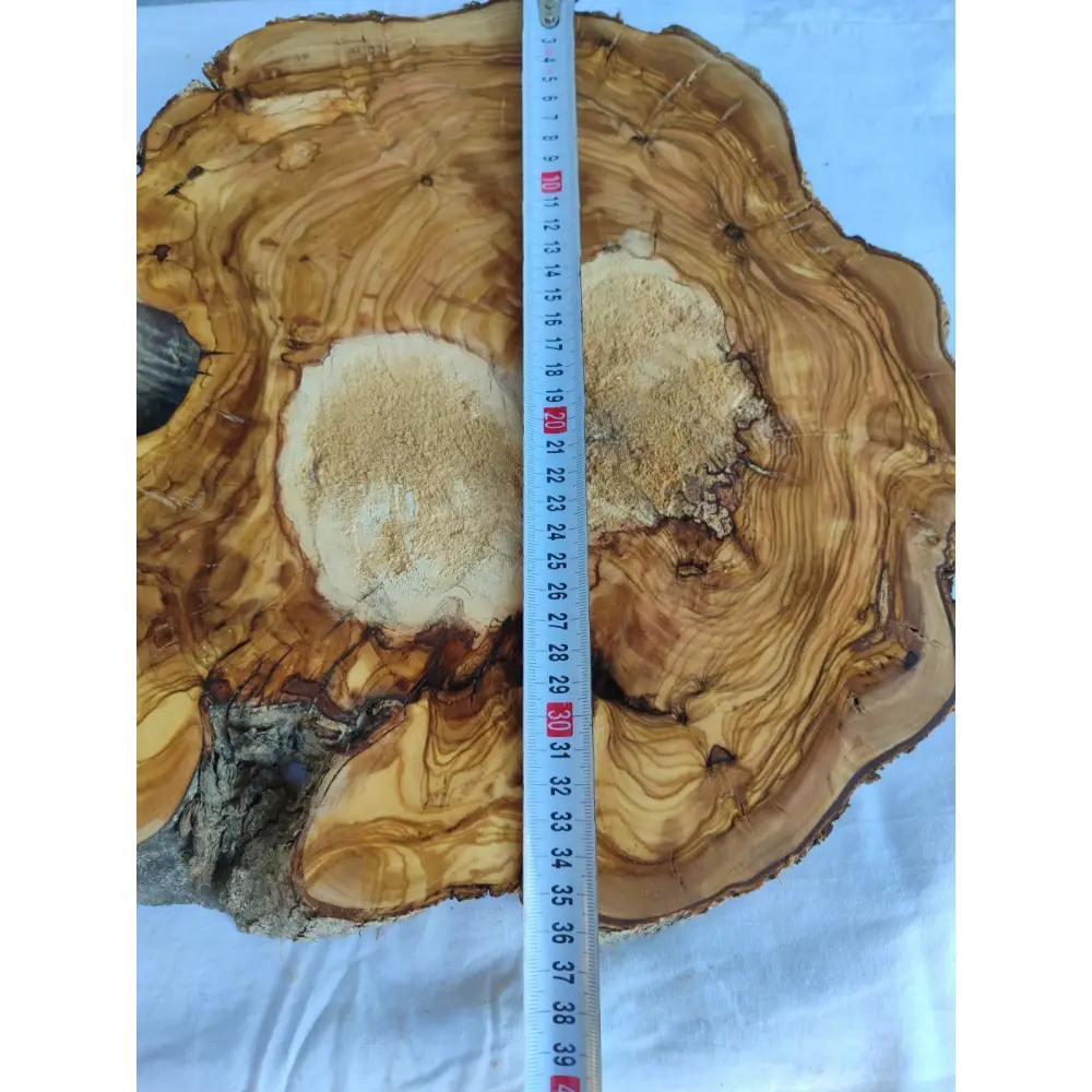 This one-of-a-kind olive wood slab is sourced from ancient Mediterranean olive trees estimated to be over 200 years old. Featuring dual natural core areas, flowing grain lines, and rich tonal contrast, this piece is ideal for epoxy resin art, decorative panels, wall decor, and fine woodworking projects.